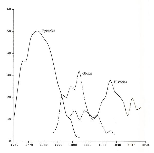 Como decía, estos estudios arrojan cierta luz sobre fenómenos que la teoría literaria más tradicional o convencional ha dejado al margen de sus preocupaciones. Es interesante, por ejemplo, el desarrollo de los géneros literarios estudiados en el primer apartado: gracias a las observaciones tan plásticas del autor, puede observarse un ritmo cíclico muy preciso en cuanto a nacimiento, auge y decadencia de géneros como la novela epistolar, la novela gótica, la novela histórica o la novela de formación. Algunos de esos ciclos se explican debido a fenómenos concretos, como las guerras; otros quedan sujetos a posteriores elucubraciones, aunque Moretti se aventura a proponer un modelo cíclico de surgimiento de géneros, provocado —en parte— por lo que denomina «mecanismo generacional»: es decir, un cambio casi total en los hábitos de los lectores. Tal y como dije antes, el autor reconoce las lagunas inherentes al descubrimiento de esos ciclos, que son bastante difíciles de explicar, pero no es menos cierto que el hallazgo de esas fases es, en sí, un acontecimiento de cierta relevancia.