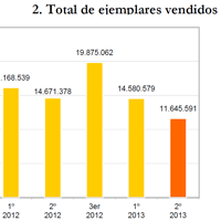 Los datos de ventas de ejemplares reproducen la caída del volumen de facturación. El número de ejemplares vendidos, durante el segundo cuatrimestre de 2013, es de 11.645.591, un 20,62% menos que en el primer cuatrimestre de 2012. El comportamiento de las ventas por ejemplares es paralelo al de las ventas por facturación.